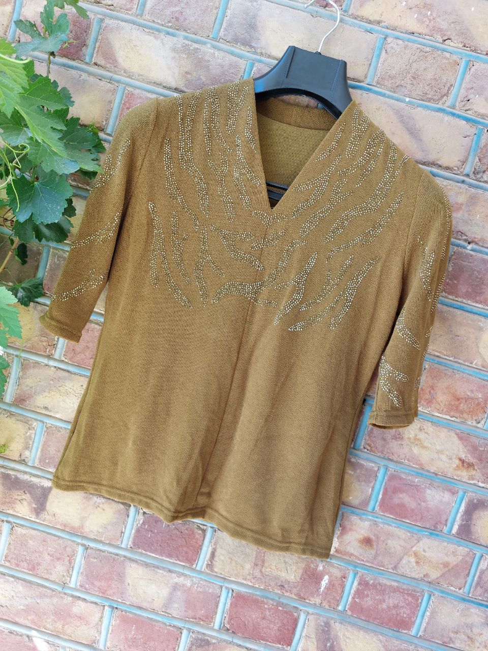 این مدل بیسکوئیتی کشی با آستین سه‌ربع و یقه هفت، هم قشنگه هم راحته
